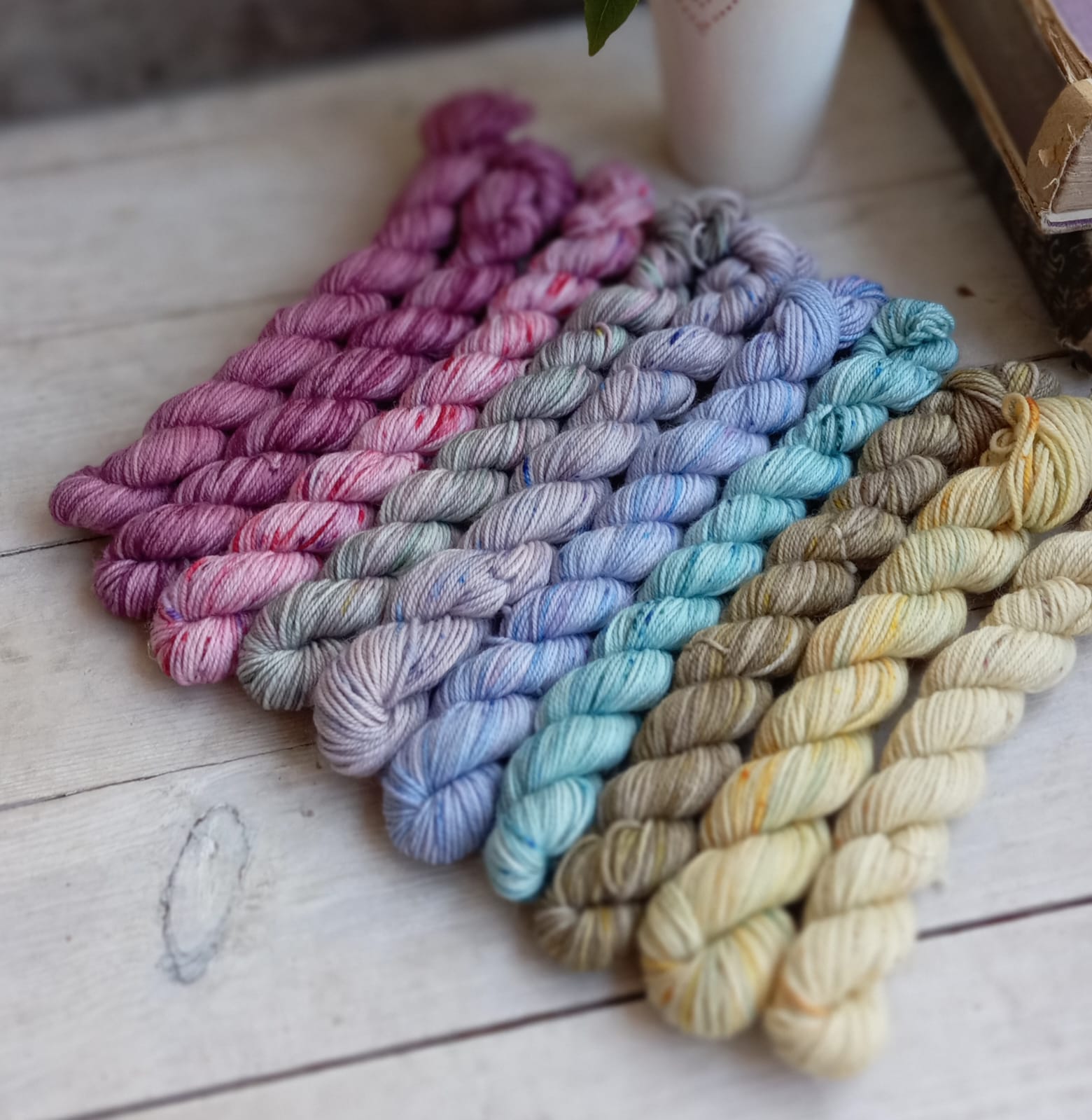 This little set contains 10 small 20gram skeins of the wonderful Wemmick Sock~ a firm 3 ply twist, with 75% superwash merino and 25% Nylon!