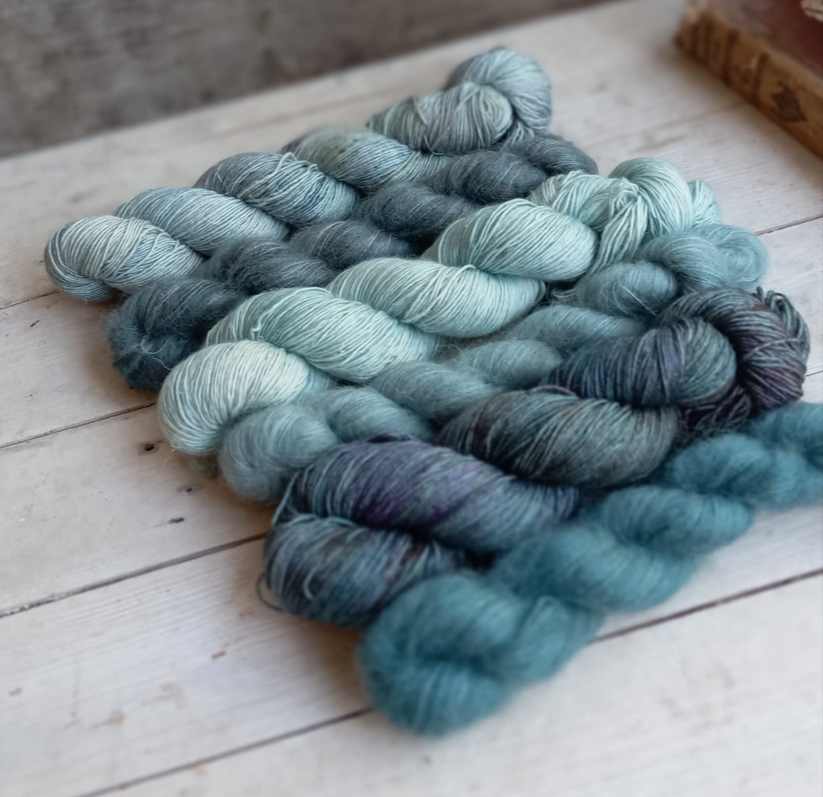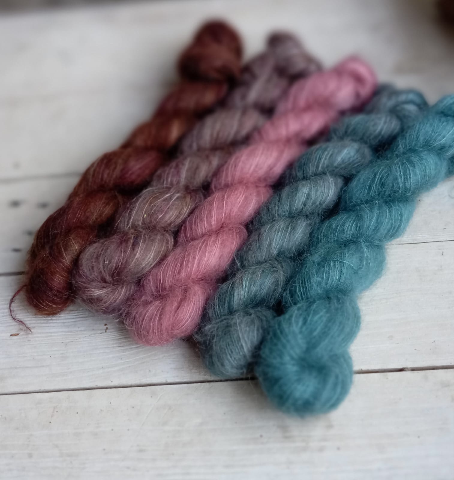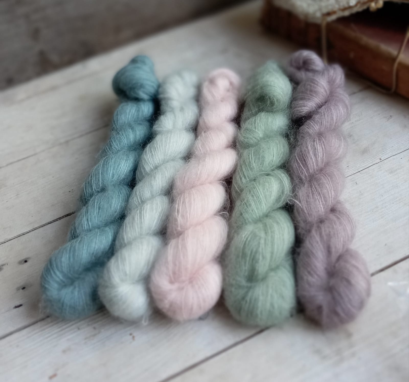 All yarns in this story have been dyed on Clara Lace, a soft brushed lace weight yarn comprising 80% kid mohair and 20% nylon. Each skein is 25grams, with 212metres.